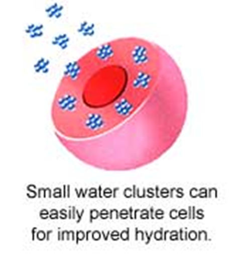 A molécula H2O não existe sozinha na natureza. A molécula H2O agrupa-se com outras moléculas H2O para formação de clusters. Quando as moléculas se agrupam em clusters de 6 H2O ela atinge uma forma hexagonal perfeita e com maior poder de hidratação que clusters maiores, com 11 moléculas de H2O