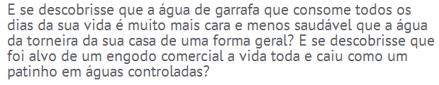 Assim, da próxima vez que considerar comprar uma garrafa de água, pense se tem oportunidade de recorrer à torneira; pensem duas vezes: uma para o ambiente, e outra para a sua carteira.